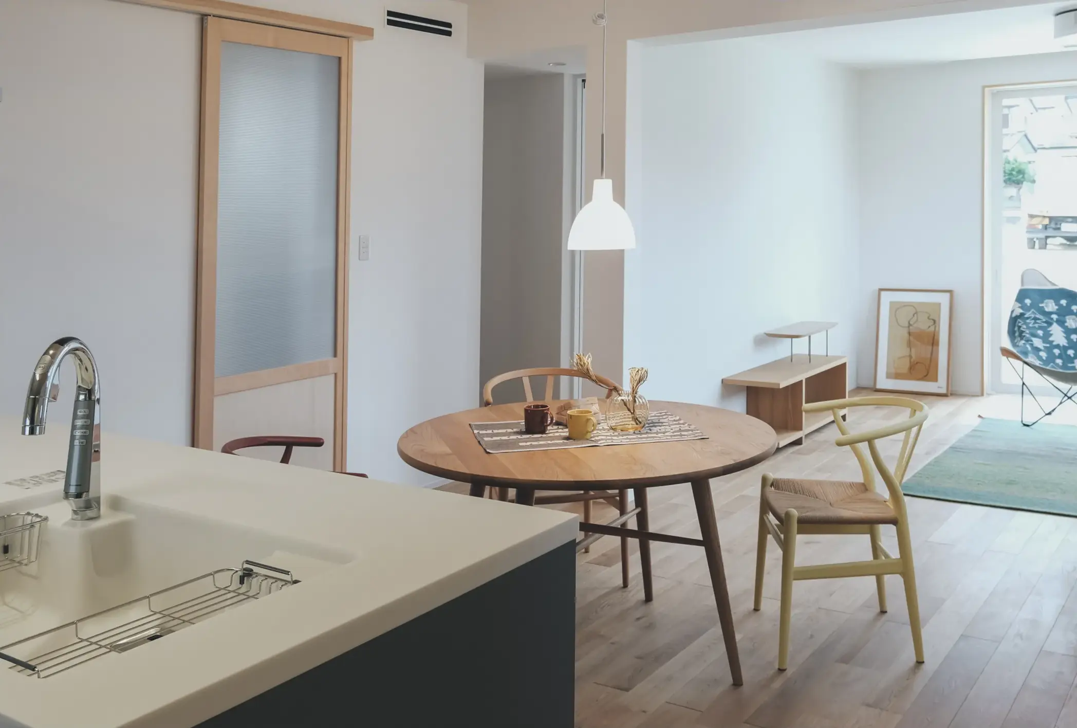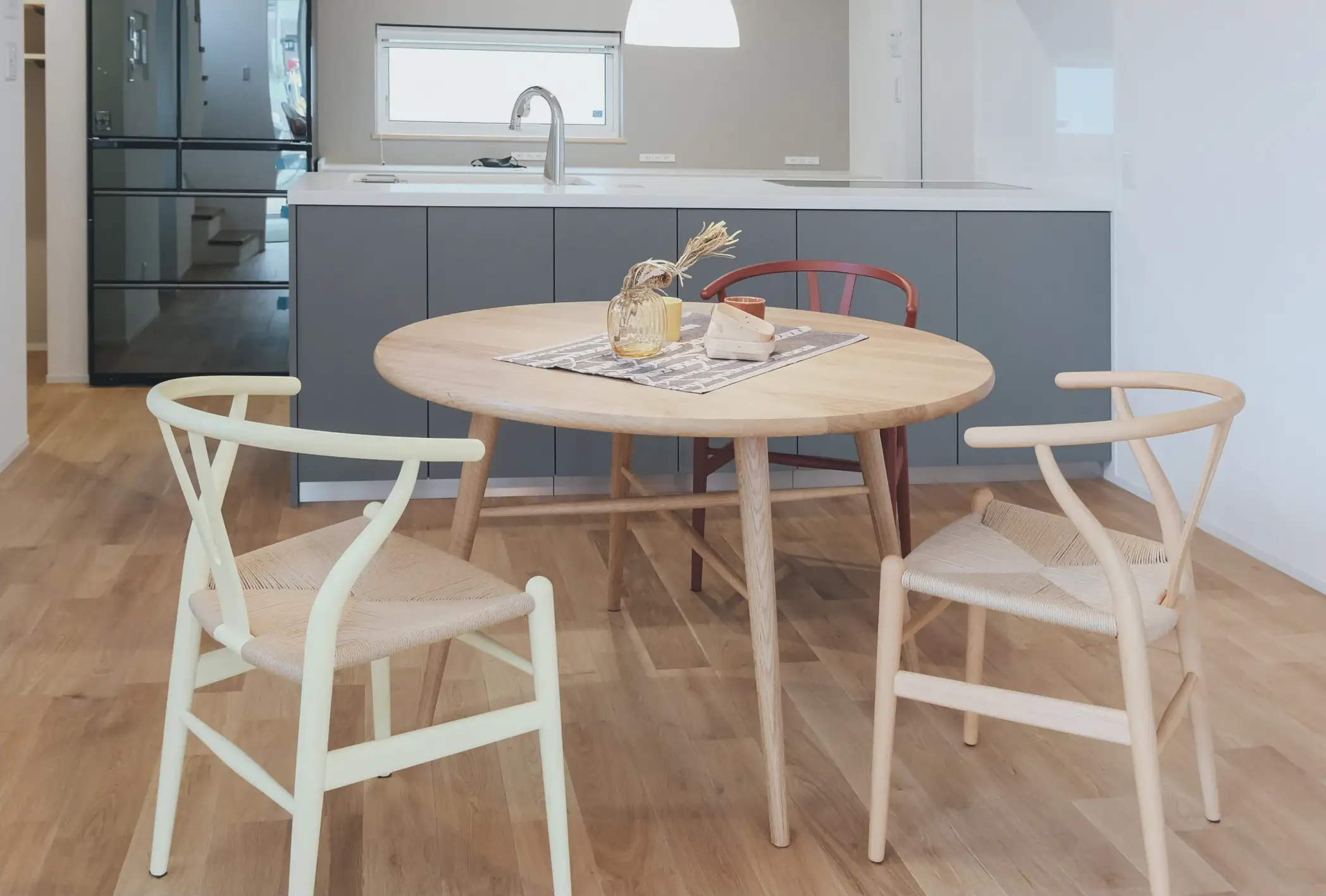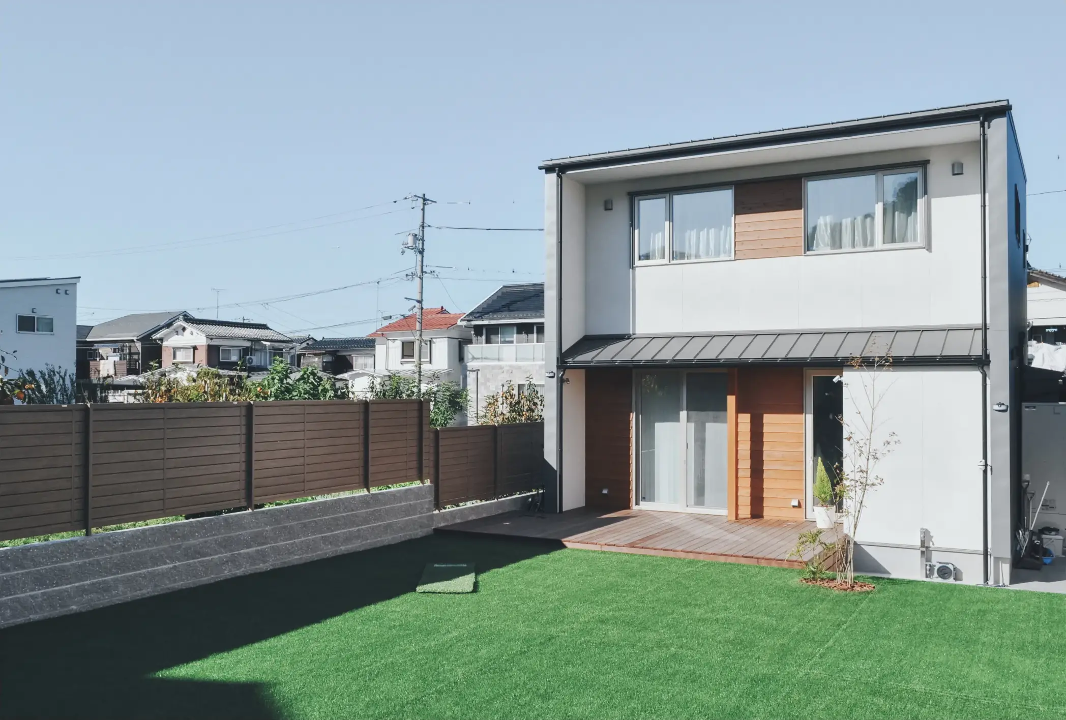食べ盛りの子どもたちが集まるキッチンを、ダイニング・リビングとつながる住まいの中心に配置しました。南側の掃き出し窓の先にあるウッドデッキは、内と外を緩やかにつなぎます。犬が日向ぼっこをし、家族のくつろぎの時間が自然と外へ広がります。芝の庭はバーベキューや野球の素振り、夏にはプール遊びも思い切りできる場所。遠くへ出かけなくても、日常の中に楽しさがある。庭が家族だけのテーマパークになる住まいです。