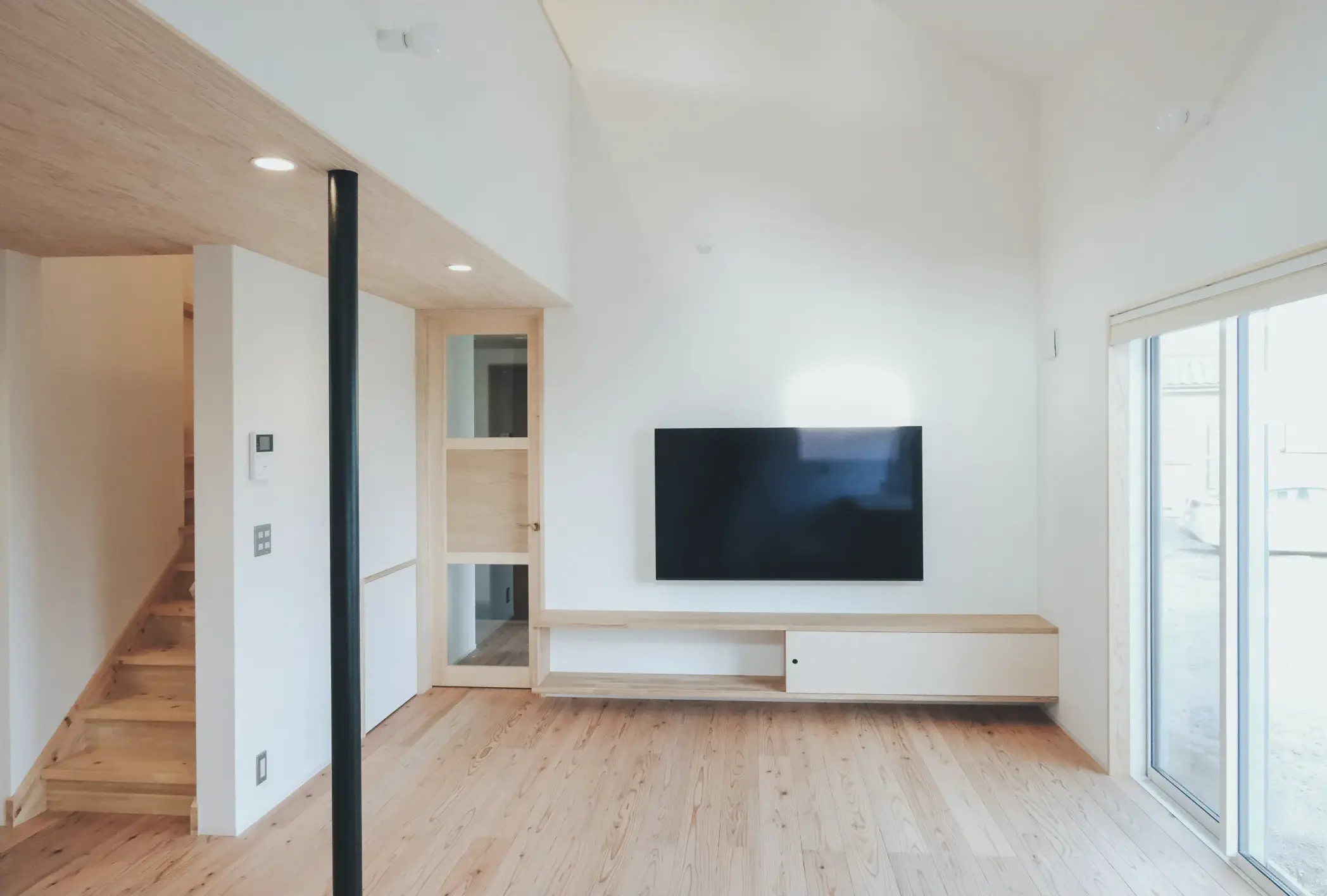 日々の暮らしが自然と続いていくよう、今とこれからを見据えた家。畳とお仏壇のある客間は、人を迎え、手を合わせる時間を静かに支えます。年齢を重ねても無理なく暮らせるように寝室は1階に。家事を支える外倉庫や小屋裏の子ども室など、生活に寄り添う工夫を重ねています。空間中央の黒い鉄柱は、構造と意匠を兼ね、白と木を基調とした空間をほどよく引き締めます。子どもたちが集い、見守れる安心感のある住まいです。